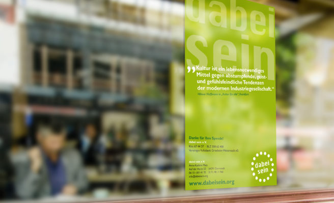 Das Projekt „Dabei sein“ ermöglicht es Menschen, die sich in finanziell prekären Lebenslagen befinden, kostenlos an kulturellen Veranstaltungen der Stadt Darmstadt und des Landkreis Darmstadt/Dieburg teilzunehmen. Bohm und Nonnen unterstützt das ehrenamtliche Projekt bei der Erstellung von Printmaterialien – unter anderem in arabischer Sprache.